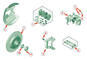 - Remove brake pads (7) and pad abutment shims (6)